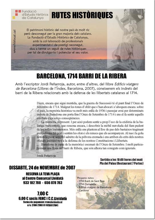 El passat dissabte 24 de novembre, la segona de les rutes organitzades per la Fundació d'Estudis Històrics de Catalunya va assolir un gran èxit amb l'assistència d'una trentena de persones. La resposta del públic va ser d'indubtable interès creixent per les RUTES HISTÒRIQUES. Gaudint de l'inestimable coneixement del Sr. Peñarroja, sobre els llocs, els edificis i els fets que es van esdevenir a la ciutat de Barcelona durant els fets de l'any 1714, vàrem poder passejar la nostra mirada encuriosida per tot el que el guia i escriptor ens anava indicant mentre deambulavem pels carrers del barri de la Ribera, el Born, el Pla de Palau, entre molts d’altres imaginant a cada pas i a cada carrer els menestrals, els botiguers, o els nobles que vivien en aquella casa forta o en aquell palau. Si desviàvem un moment la mirada de la gent amb la qual ens creuaven podíem fins i tot arribar a notar l'imperceptible remor dels carrers que ens traslladaven a èpoques passades, podíem arribar a sentir alhora l'espiritualitat que ens envaí de sobte, quan entrarem a la majestuosa església de santa Maria del Mar. Tot plegat, una passejada guiada que ens va permetre conèixer nous amics interessats per la història i per la tasca que estem duent a terme, noves persones que de la mateixa manera que nosaltres, es van sentir sorpresos en descobrir tantes històries que pertanyen i segueixen estretament vinculades als edificis, a les places i als carrers, coneixement i comprensió que ens va apropar molt més de tota aquella gent que va viure els fets del 1714 al barri de la Ribera.