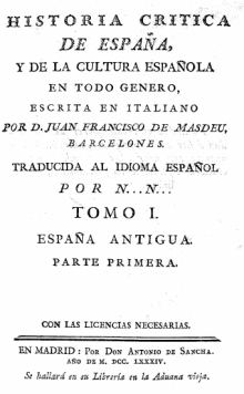 Ens estem referint a la veu de l’historiador Joan Francesc de Masdeu (Palerm, 1744- València, 1817). Especialista en història antiga i epigrafia, Masdeu és l’autor dels 20 volums de la Història crítica d’Espanya. La substitució del mot general, que caracteritzava i caracteritzarà les històries d’Espanya dels castellans fins a ben avançat el segle XIX, per la paraula crítica informa ja d’un canvi de paràmetres interpretatius que faran d’aquesta obra un referent important en l’escena historiogràfica del moment.
