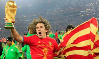 La Spagna è campione del mondo di calcio. Per la prima volta nella propria storia, le furie rosse vincono la massima competizione calcistica planetaria e bissano il successo agli Europei di due anni fa. Ma la vittoria è davvero spagnola? Ben cinque undicesimi degli uomini titolari di Del Bosque sono catalani, giocatori della Selecció. Puyol (nella foto), Busquets, Piqué, Capdevila, Xavi sono titolari inamovibili nelle furie rosse, ma anche nella nazionale del Principat. Sei undicesimi se consideriamo anche Raül Albiol che, come valenciano, rientra nei Paesi Catalani e, perciò, nella Selecció.