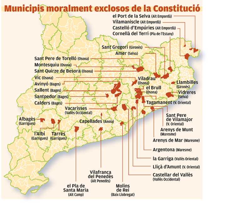 5 capitals de comarca i 41 poblacions catalanes entre les "moralment fora de la constitució espanyola" i les que estan per “iniciar els tràmits oportuns per obrir el procés que ens ha de portar a la independència”.