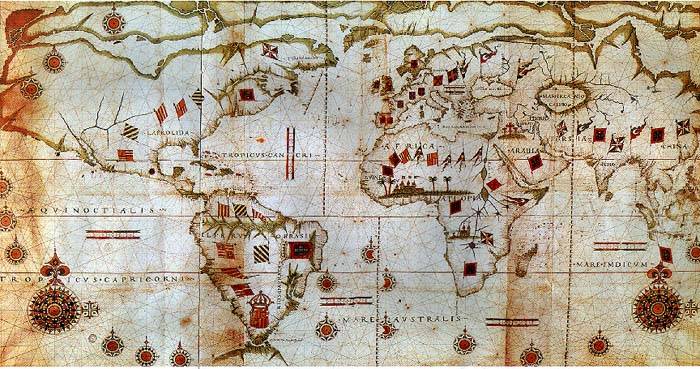 Per exemple, un mapa portuguès de 1519 de Pedro Reinel, conservat a la Biblioteca de Baviera de Munic, inclou senyeres a la costa mediterrània de la Península Ibèrica, a les Canàries, a Florida, al Yucatan-Hondures-Panamà, i a la costa del que avui és Veneçuela i les Guayanes. Com si aquests territoris depenguessin només de la Corona d’Aragó. Un altre exemple.