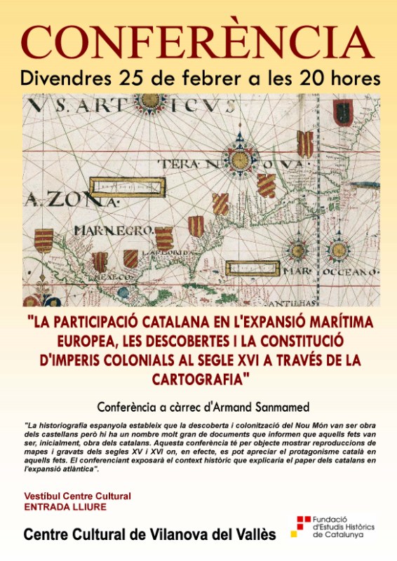 Divendres 25 de febrer, a les 20:00 hores, al Centre Cultural de Vilanova del Vallès, Armand Sanmamed va pronunciar una conferència amb el títol "La participació catalana en l'expansió marítima europea, les descobertes i la constitució d'imperis colonials al segle XVI a través de la cartografia".