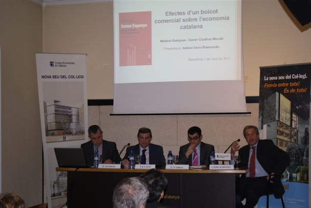 La Seu del Col·legi d'Economistes de Catalunya ha estat l'escenari de presentació del llibre Sense Espanya. Balanç econòmic de la independència (Ed. Pòrtic). El llibre, dels doctors en economia i professors de la Universitat Pompeu Fabra Modest Guinjoan i Xavier Cuadras, ha estat presentat pel degà del Col·legi d'Economistes de Catalunya, Joan B. Casas i per l'autor del pròleg Antoni Serra Ramoneda, expresident de Caixa Catalunya. En el transcurs de l'acte els dos autors, Modest Guinjoan i Xavier Cuadras, han analitzat alguns efectes econòmics que podria tenir l'inici d'un procés cap a la independència de Catalunya.