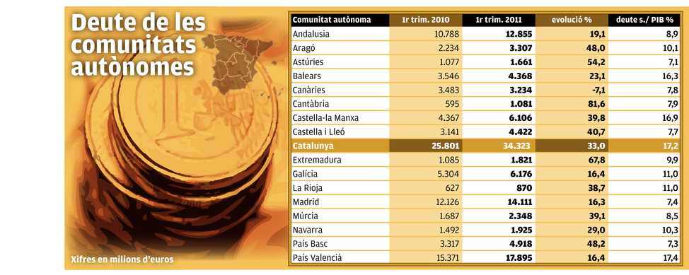 En el quadre següent tenim el resum del deute de les regions espanyoles respecte al PIB corresponent, agrupades per llur condició política castellana, navarra-basca i ibera. El detall per cada regió autonòmica es pot llegir en el quadre de l'article publicat al diari EL PUNT-AVUI que adjuntem.