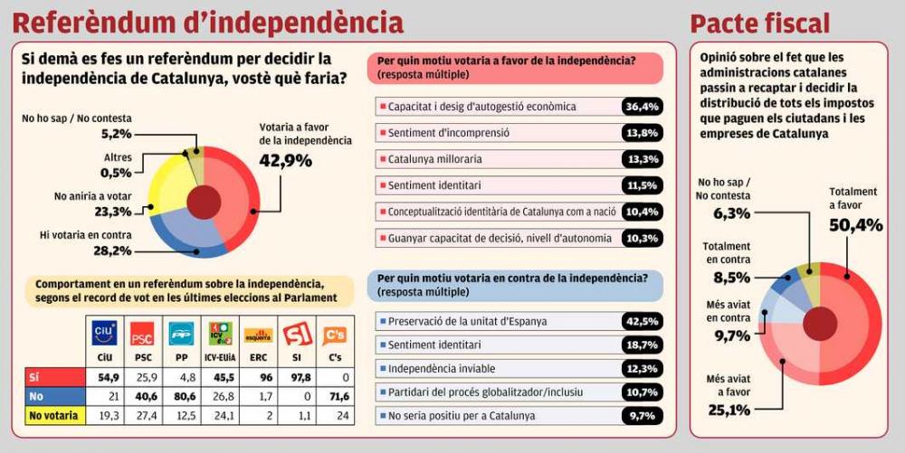 “Sí” aclaparador. Si se celebrés un referèndum sobre la independència, Catalunya elegiria democràticament divorciar-se d'Espanya. Així ho indica l'últim Baròmetre d'Opinió Política del Centre d'Estudis d'Opinió, que per primer cop pregunta sobre una hipotètica consulta de secessió. Un 42,9% dels enquestats votarien a favor de la independència, un 28,2% s'hi pronunciarien en contra i un 23,3% no anirien a votar.