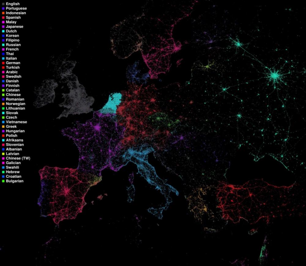 S’ha elaborat un mapamundi que visualitza les zones on es generen més piulades a Twitter segons la comunitat lingüística dels piuladors. Es basa en les dades obtingudes pel detector lingüístic del navegador Chrome i pinta cada llengua amb un color diferent. En l’ampliació d’Europa, el català hi apareix clarament destacat, especialment al Principat. El resultat permet apreciar la vitalitat que el català té en aquesta popular xarxa social.