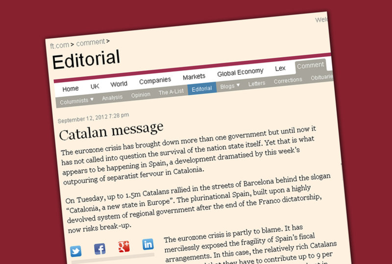 Les tensions entre Catalunya i Espanya i la possible independència del país s'han fet un lloc a l'editorial d'aquest dijous del Financial Times. El text, titulat El missatge català, explica les reivindicacions del poble de Catalunya i les contrasta amb l'actitud dels sectors més extrems del PP de Mariano Rajoy. L'editorial assegura que Artur Mas i Rajoy “en un escenari ideal acordarien un millor model fiscal” però que ara “la prioritat és solucionar l'emergència econòmica”. Per tant, el diari conclou que Mas tornarà el dia 20 de Madrid “amb les mans buides, i convocarà unes eleccions anticipades que seran un referèndum independentista”. “S'aproxima una crisi constitucional”, destaca.