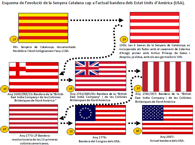 Penso que aquesta bandera “de tipologia/ascendència catalana”, fou la precursora de la bandera de la “British East India Company” la de les Colònies Britàniques de Nord Amèrica i d’aquí de pet evolucionant cap la bandera dels USA. Per tant, no s’ha de descartar que, per aquest motiu entre d’altres, la bandera catalana fos la “besàvia” de la bandera dels USA.