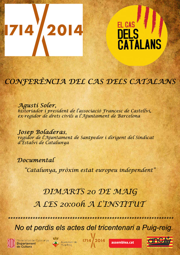 El proper dimarts dia 20 de maig, organitzat per l’Assemblea Nacional Catalana local, farem la presentación del Cas dels Catalans com a part dels actes de commemoració del Tricentenari del 1714 de Puig-reig. L’acte, amb el nom de «Conferència del cas dels catalans» serà a les vuit de la tarda a l'Institut, Passeig Riera de la Sala, 3.