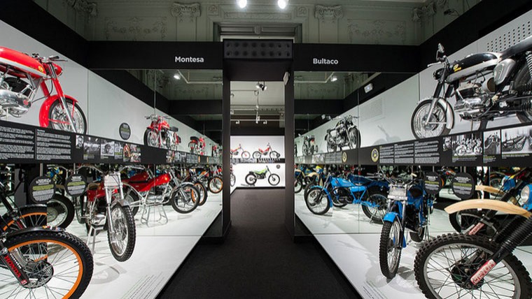 El recorregut expositiu ja comença a la mateixa entrada del Palau Robert amb el gran aparador dedicat a les marques catalanes de motos de trial: Bultaco, Ossa o Montesa. Una modalitat del motociclisme català, amb més de 50 anys d’història, que vincula la indústria, la innovació, les escoles de pilots i els èxits esportius.