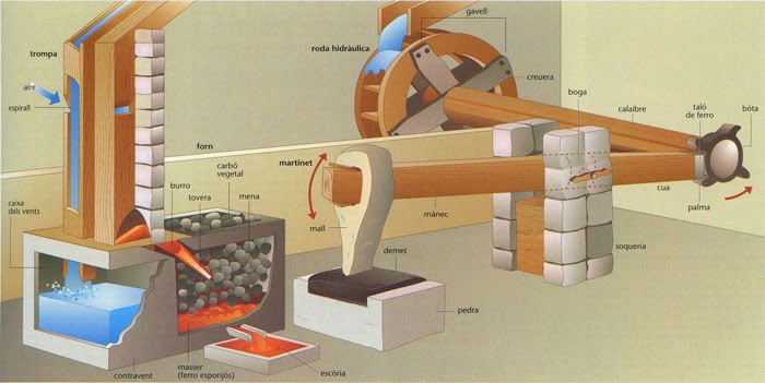 martellejada per un mall o martinet d’uns 500 kg de pes, per tal d’eliminar les escòries i d’anar donant forma als diferents tamanys de barres. També era una novetat la forma de posar el carbó i el mineral: es col·locaven en sentit vertical (i no horitzontal, com anteriorment, que es posaven de manera alternada una capa de mineral i una de carbó), amb l’objectiu que el mineral recolzés sobre la paret inclinada de sortida.